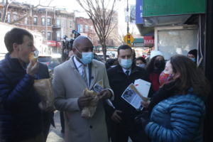 ASSEMBLYWOMAN CATALINA CRUZ SPEAKS WITH A BUSINESS OWNER IN JACKSON HEIGHTS AS QUEENS CHAMBER CEO TOM GRECH LOOKS ON.