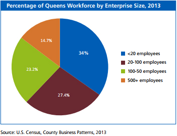Queens has a larger share of its employment in businesses with less than 20 employees (34.8 percent) than the city as a whole (27.8 percent). Notably, entrepreneurship is increasing in the borough, with 11.8 percent of all new jobs in the last five years added by firms less than one year old.